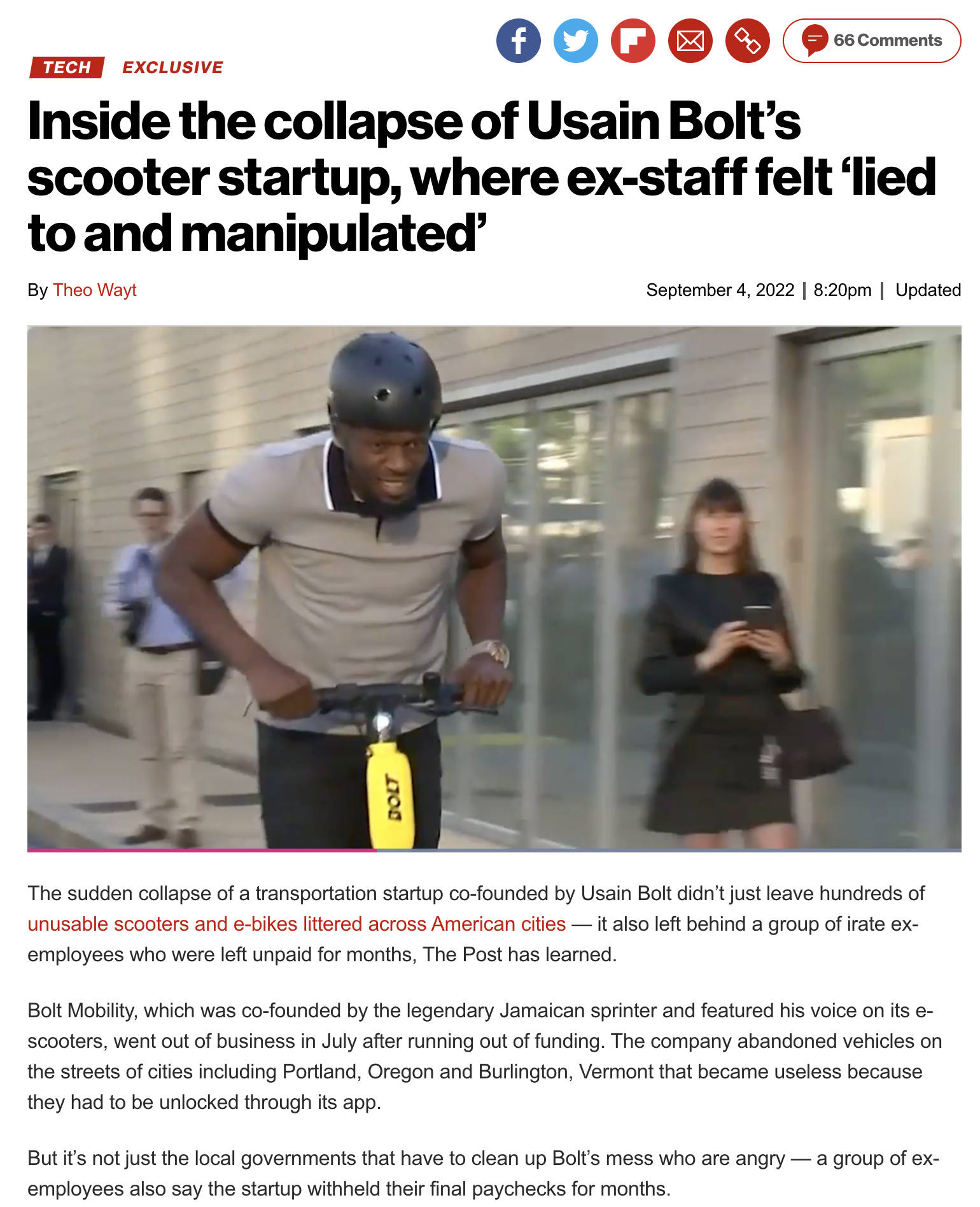 @bolt_now the company co-founded by @usainbolt ceased operations due to a lack of funding. They have fired hundreds of employees and left dozens of scooters abandoned in over 7 cities across the country including Miami where the company is based. This is the same company whose faulty equipment lead to me breaking my leg in 2019 and requiring surgery and months of physical therapy and lost wages. Now with the company nearing bankruptcy, my mediation with attorneys for a settlement has been canceled. My leg is still in recovery and I have surgical metal in there for the rest of my life. My outstanding hospital bill is upwards of 65K. Meanwhile, this company has gone media silent. No one is talking about this. What would you do in this situation?